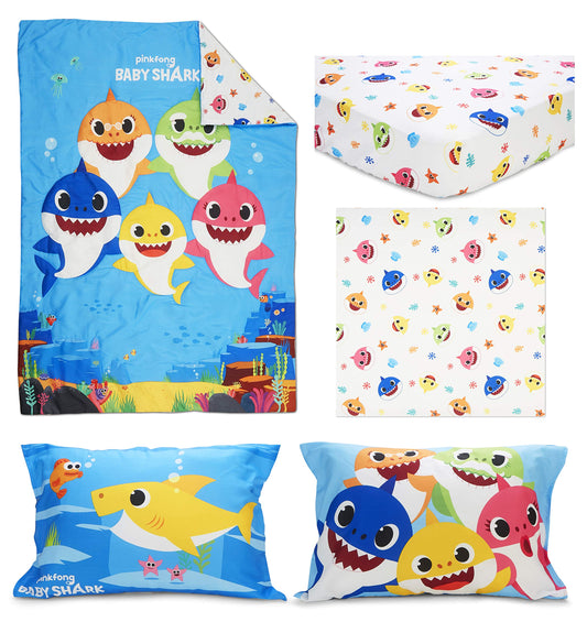 Baby Shark 4-Piece Toddler Bed Set including Super Soft Matching Sheets Set, Pillowcase, and Reversable Comforter For Boys and Girls - (Offical Product)