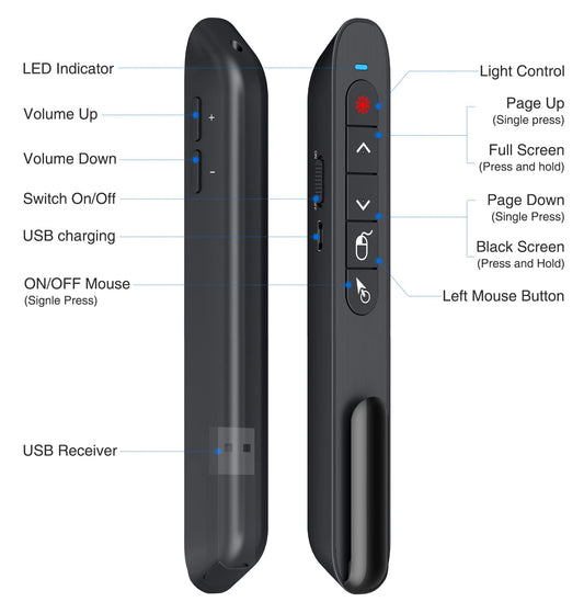 DINOSTRIKE Wireless Presenter Remote with Air Mouse Control, Rechargeable USB Presentation Clicker PPT Pointer RF 2.4GZ PowerPoint Clicker Slide Advancer for Computer Laptop Mac