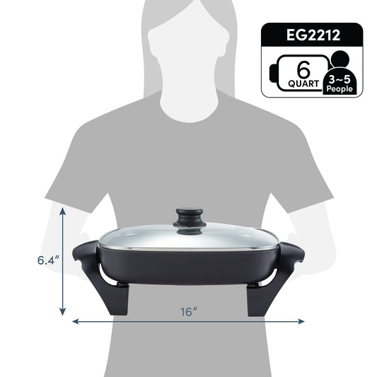 Elite Gourmet EG2212 12"x12"x2.15” Ceralast™ PFAS Free Ceramic Electric Skillet, Dishwasher Safe, Rapid Heat Up, 1200W, Dark Grey