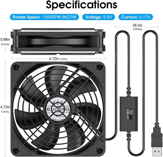 ELUTENG 120mm Fan With 3 Speed 5V USB Powered Case Fan 1500PRM Gaming PC Portable Cooling Suitable for Tablet TV Receiver Router DVR Play Station Xbox Computer and More