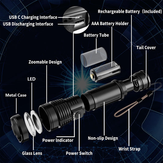 Esgofo Rechargeable Flashlights High Lumens 1000000 Long Range 3280FT, Super Bright Handheld Strong LED Flashlight Long Lasting 15H, Powerful Flash Light USB C, Zoomable 5 Modes, for Camping Hiking