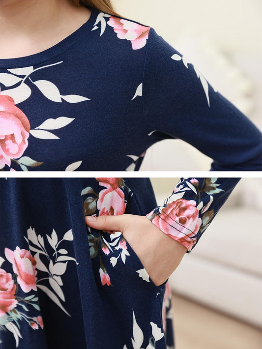 GORLYA Girls Short Sleeve Floral Print Casual Fit and Flare Party Dress with Pockets 4-12 Years (GA1002,10Y,NavyPrint-L)