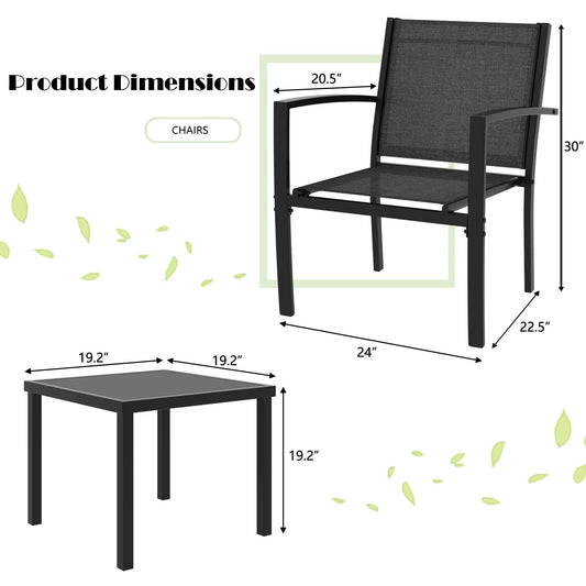Greesum 3 Pieces Patio Furniture Set Outdoor Conversation Textilene Fabric Chairs for Lawn, Garden, Balcony, Poolside with A Glass Coffee Table, Black