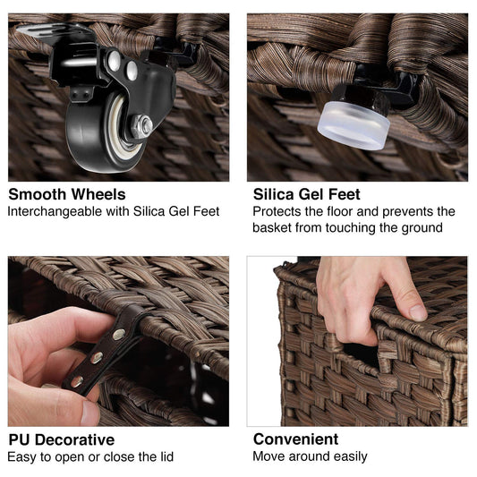 Greenstell Laundry Hamper with Wheels, No Install Needed, 110L Divided Handwoven Hampers & 2 Removable Liner Bags, Rattan Clothes Laundry Basket with Lid & Handles, Foldable Hampers Brown 22x13x26.4In