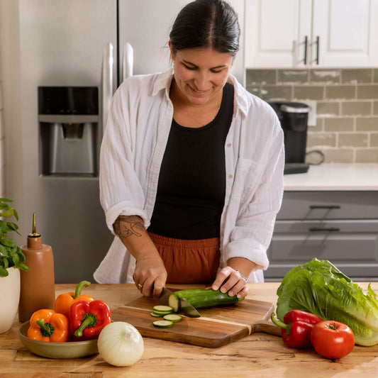 Acacia Wood Cutting Board and Chopping Board with Handle for Meat, Cheese Board, Vegetables, Bread, and Charcuterie - Decorative Wooden Serving Board for Kitchen and Dining Room, Large 17" x 13"