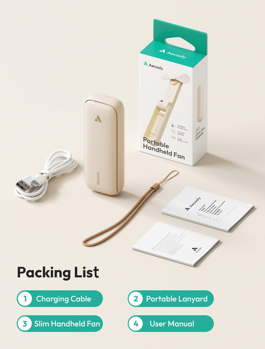 Aecooly Slim Portable Fan, Thin Handheld Fan, USB Rechargeable Mini Personal [24H Max Cooling Time], Battery Powered Small Foldable Pocket for Travel, Summer, Gifts for Women, Girls -Beige