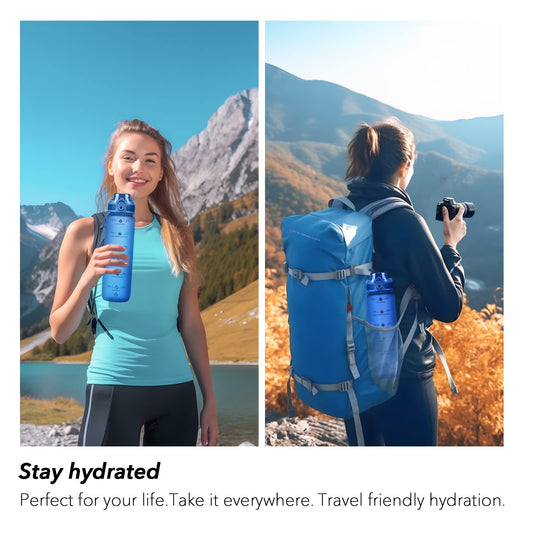 Alwager 32oz Motivational Water Bottles with Time Marker & Fruit Strainer, Single Color Water Bottle with Times to Drink, Leakproof & BPA Free, Reusable Plastic Bottle with Strap (No Straw)