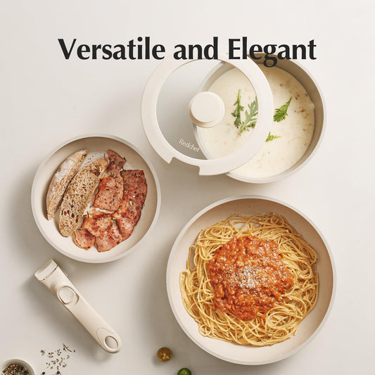 Redchef Ceramic Pots and Pans Set Non Stick, Nonstick Kitchen Cookware Sets, Non Toxic Pots and Pans Set Non Stick, PFAS PFOA & PTFE Free, Detachable Handle Pots and Pans 5 Piece, RV Cookware