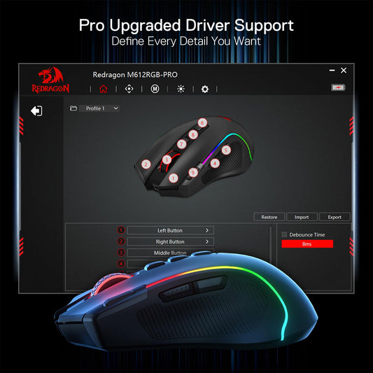 Redragon M612 PRO RGB Gaming Mouse, 8000 DPI Wired/Wireless Optical Mouse with 9 Programmable Buttons & 7 Backlit Modes, BT & 2.4G Wireless, Software Supports DIY Keybinds Rapid Fire Button