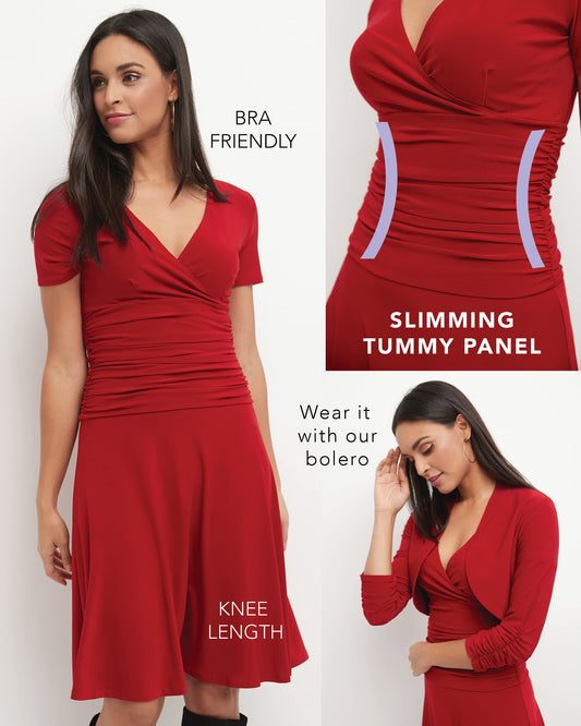 Rekucci Women's Slimming Short Sleeve Fit-N-Flare Crossover Tummy Control Dress (8 Short, Navy)