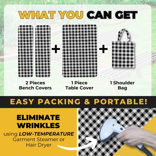 RNOONY Vinyl Fitted Picnic Table Cover with Bench Covers and Bag, 6ft Outdoor Waterproof Windproof Tablecloth with Elastic Edges. Camping RV Gear Campers Must Have 72x30 Inches 4 Pcs Set (Black)