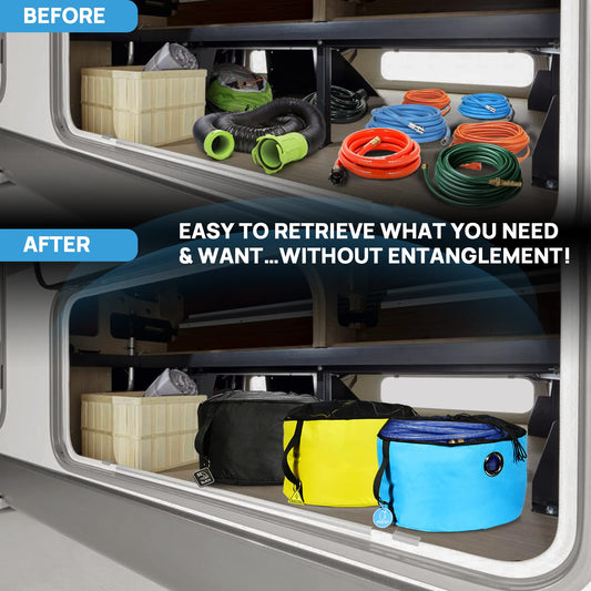 RV Hose Storage Bag of 3 Pack, Camper Accessories for Outside, Rubber Identification Tags for Fresh/Black Water Sewer Hoses Electrical Cords & Accessories, 3 Colors of RV Equipment Storage Utility Bag