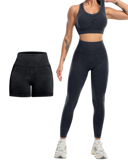 SALSPOR 3 Piece Workout Sets for Women Butt Lifting Leggings with High Impact Sports Bra Gym Shorts Activewear Matching Set(3DWX-Washed Black-M)