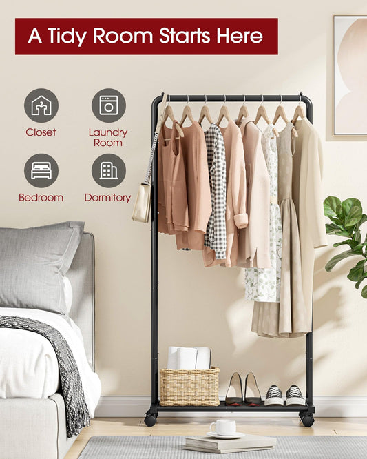 Sakugi Clothes Rack - Clothing Rack with Storage Mesh Shelf & Casters, Heavy-Duty Metal Clothing Rack for Hanging Clothes, Dresses, Coats, Large Load Capacity, Easy Assembly, Black, 28.0"x14.0"x59.0"