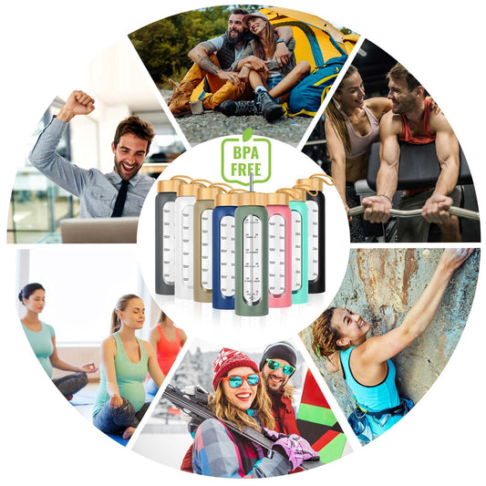 SipZest 32 oz Glass Water Bottles with Straw - Motivational Bottle with Time Marker & Silicone Sleeve - Reusable Tumbler Includes 2 Bamboo Lids & Fruit Infuser - 1 Pack