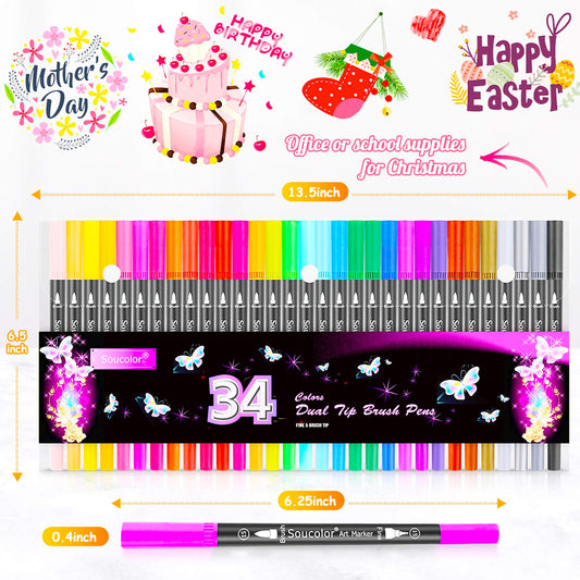 Soucolor Art Brush Markers Pens for Adult Coloring Books, Cute Preppy Stuff School Office Teacher Supplies, 34 Colors Dual Tip (Brush and Fine Point) Drawing Markers for Note Taking Journal Classroom