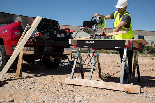 Steelman Adjustable Height Work Table Folding Sawhorses, Set of Two, Durable Steel Construction, Folding Legs, 2x4 Table Support Arms, 2,600 lb. Combined Loading Capacity