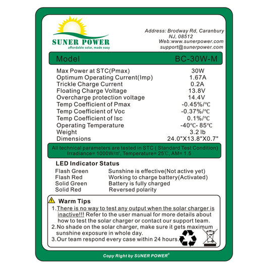 SUNER POWER 30W 12V Solar Battery Charger Maintainer, Built-in Smart MPPT Charge Controller, Adjustable Mount Bracket, Waterproof 30 Watt Solar Panel Kits for Car Automotive Boat Marine RV Trailer