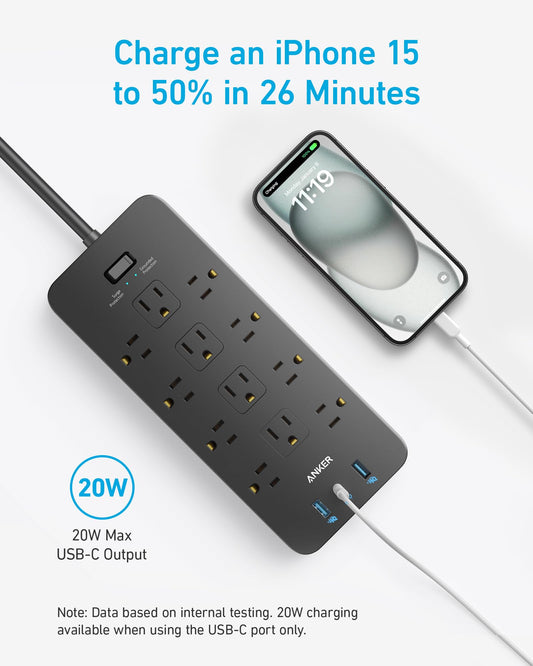 Surge Protector Power Strip (2100J), Anker 12 Outlets with 1 USB C and 2 USB Ports foriPhone 15/15 Plus/15 Pro/15 Pro Max, 5ft Extension Cord, Flat Plug, 20W USB C Charging for Home, Office,TUV Listed