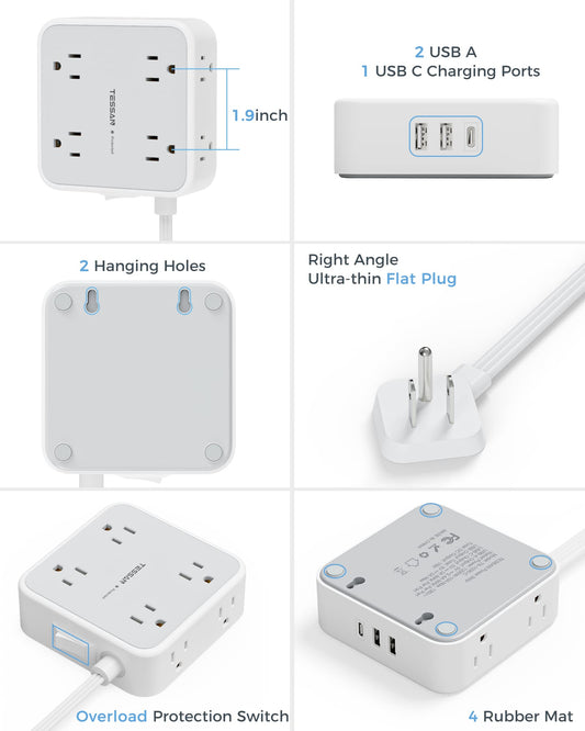 TESSAN Surge Protector Flat Extension Cord Flat Plug Power Strip, 8 AC Outlets, 3 USB Charger(1 USB C Port) 3 Sided Outlet Extender, 5 Ft, 900 Joules Protection, Office Supplies, Dorm Room Essentials