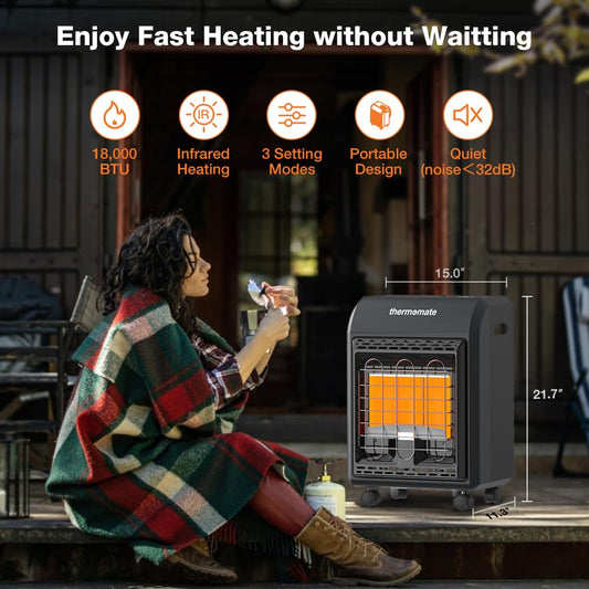 ThermoMate Propane Heater 18000 BTU With ODS & Tip-over Protection, Outdoor Gas Heater for Patio, Garage, Camping, Shop - Heating Up to 450 Sq. Ft, Gas Regulator & Hose Included