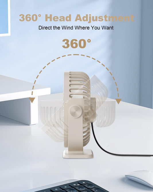 TriPole USB Desk Fan Small Portable Personal Fan, 3 Speeds Adjustable Strong Breeze Mini Electric Fan, 360° Rotation Quiet Plug In USB Fan for Desktop Bedroom Office Table Travel Cruise, Beige, 4.5in