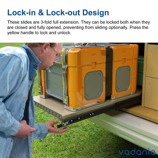 VADANIA 48" Ultra Heavy Duty Drawer Slide with Lock #VD2576-b, 3" Widening Black-electroplated Cold-Rolled Steel, Industrial Grade Heavy Load Capacity, 3-Fold Full Extension, Side Mount, 1-Pair