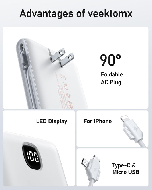 VEEKTOMX Portable Charger with Built in Cables 10000mAh, Power Bank for iPhone with Wall Plug, Travel Essential Fast Charging USB C Slim External Battery Pack for iPhone16/15/14, Samsung, iPad, etc