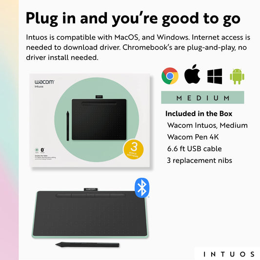 Wacom Intuos Medium Bluetooth Graphics Drawing Tablet, Portable for Teachers, Students and Creators, 4 Customizable ExpressKeys, Compatible with Chromebook Mac OS Android and Windows - Pistachio