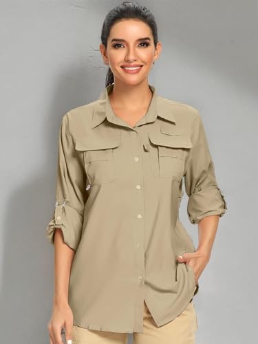 Women's UPF Long Sleeve Fishing Shirts Button Up Hiking Safari Shirts Sun Protection and Quick Dry,Khaki,XXXL