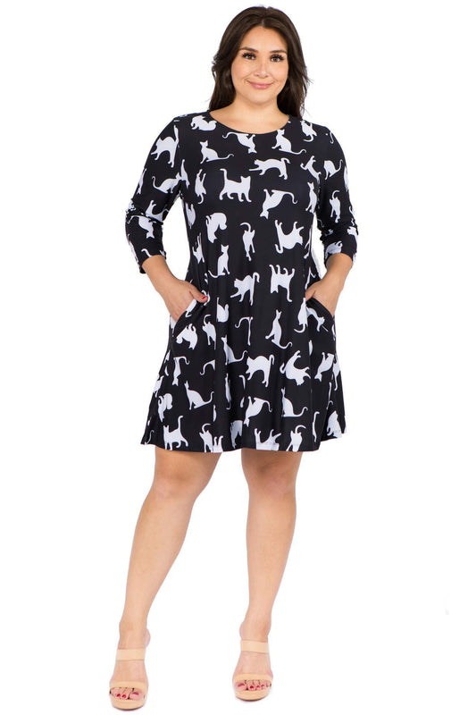 Women's Plus Size Novelty Cat Print Dresses with Pockets 2X Casual 3/4 Sleeves Crew Neck Fit and Flare Dress Balck White Kitty