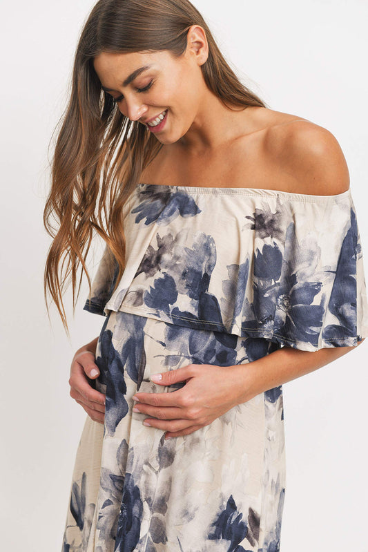 Women's Off Shoulder Ruffle Maxi Maternity Dress (Taupe/Navy Floral, L)