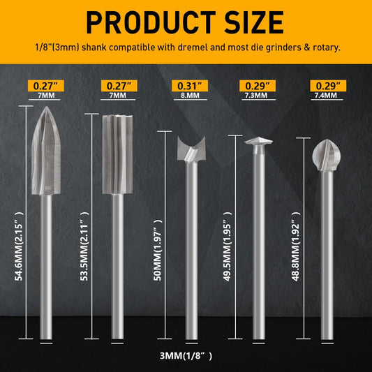 Wood Carving Drill Bits Set Compatible with Dremel Rotary Tool 5 Different Engraving Drill Accessories Bit Wood Grinding Woodworking Tool with 3mm Shank for DIY Carving Drilling Micro Sculpture