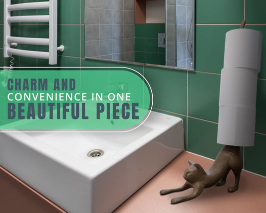 Yoga Cat Decorative Paper Towel Holder or Toilet Paper Holder - Adorable Downward Dog Pose Kitty - Cast Iron Paper Towel Stand - Antiqued Cast Iron Storage - Multiple uses - 19” Tall