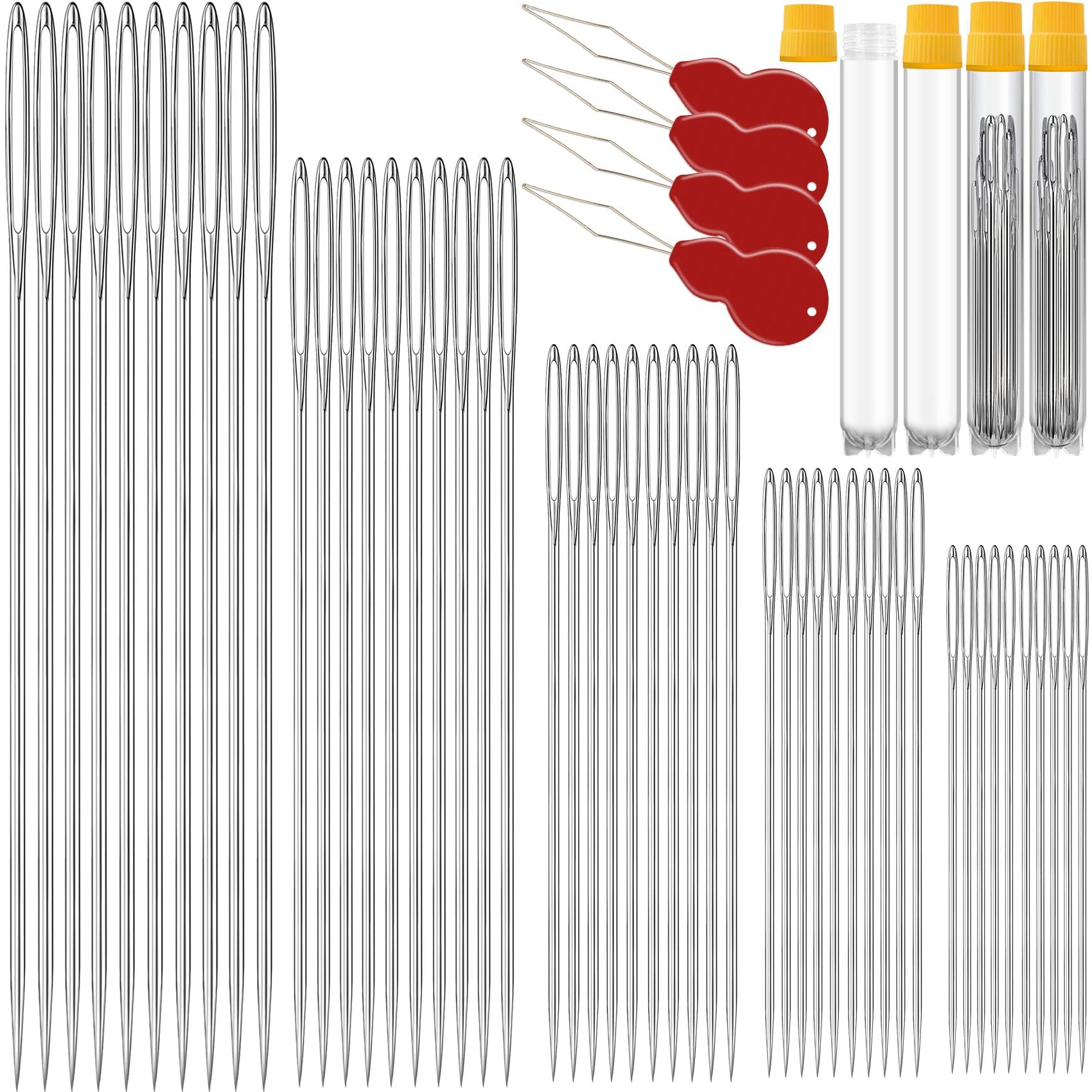 EAUTIFUL Tube: 100pcs Hand Sewing Needles in 4 Transparent Storage Tube. All Needles in Assorted Sizes : 20pcs 2.4 inch (super large eye needle), 20pcs 2.2 inch (super large eye needle), 20pcs 2.0 inch (large eye needle), 20pcs 1.8 inch(large eye needle), 20pcs 1.6 inch(large eye needle)