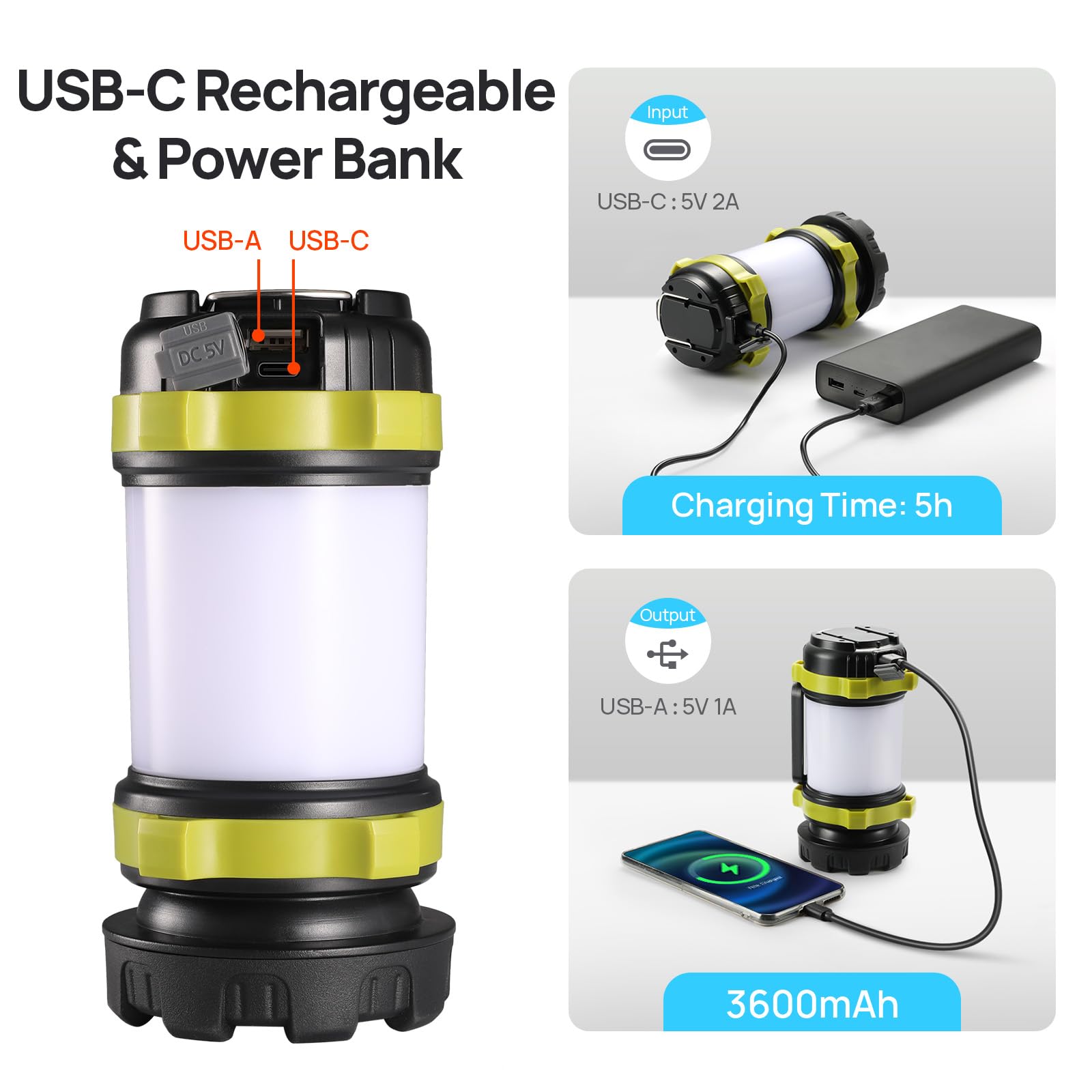 2 Pack LED Camping Lantern Flashlight Rechargeable, Consciot Portable Torch with 6 Light Modes, 3600mAh Power Bank, IPX4 Waterproof, USB C, Camping Lights for Hurricane, Emergency, Survival Kits