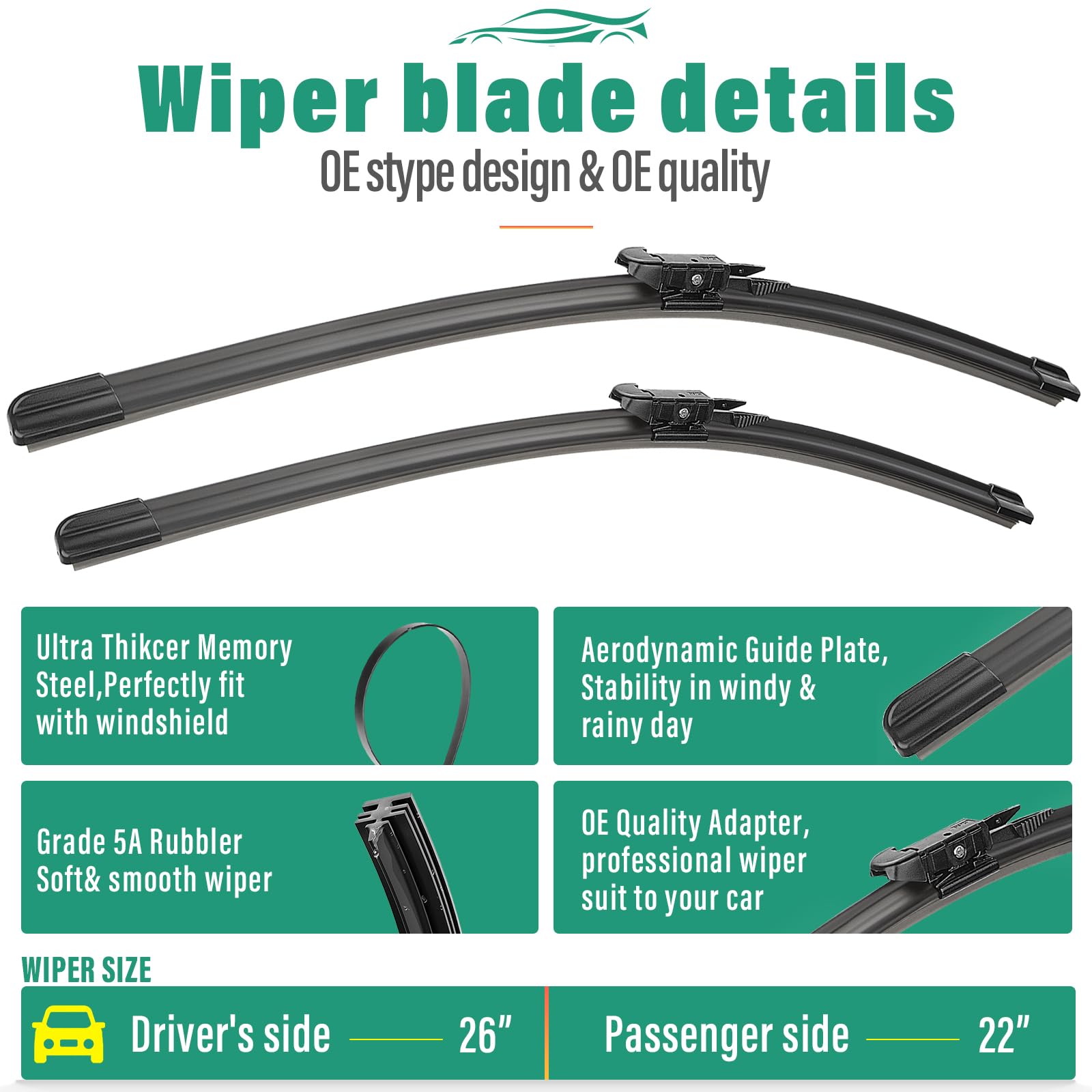 • [FITMENT]: Replacement for 2011 2012 2013 2014 2015 2016 2017 2018 2019 2020 2021 2022 2023 2024 Ford Explorer 26inch + 22inch front with 11inch rear windshield wiper blades.