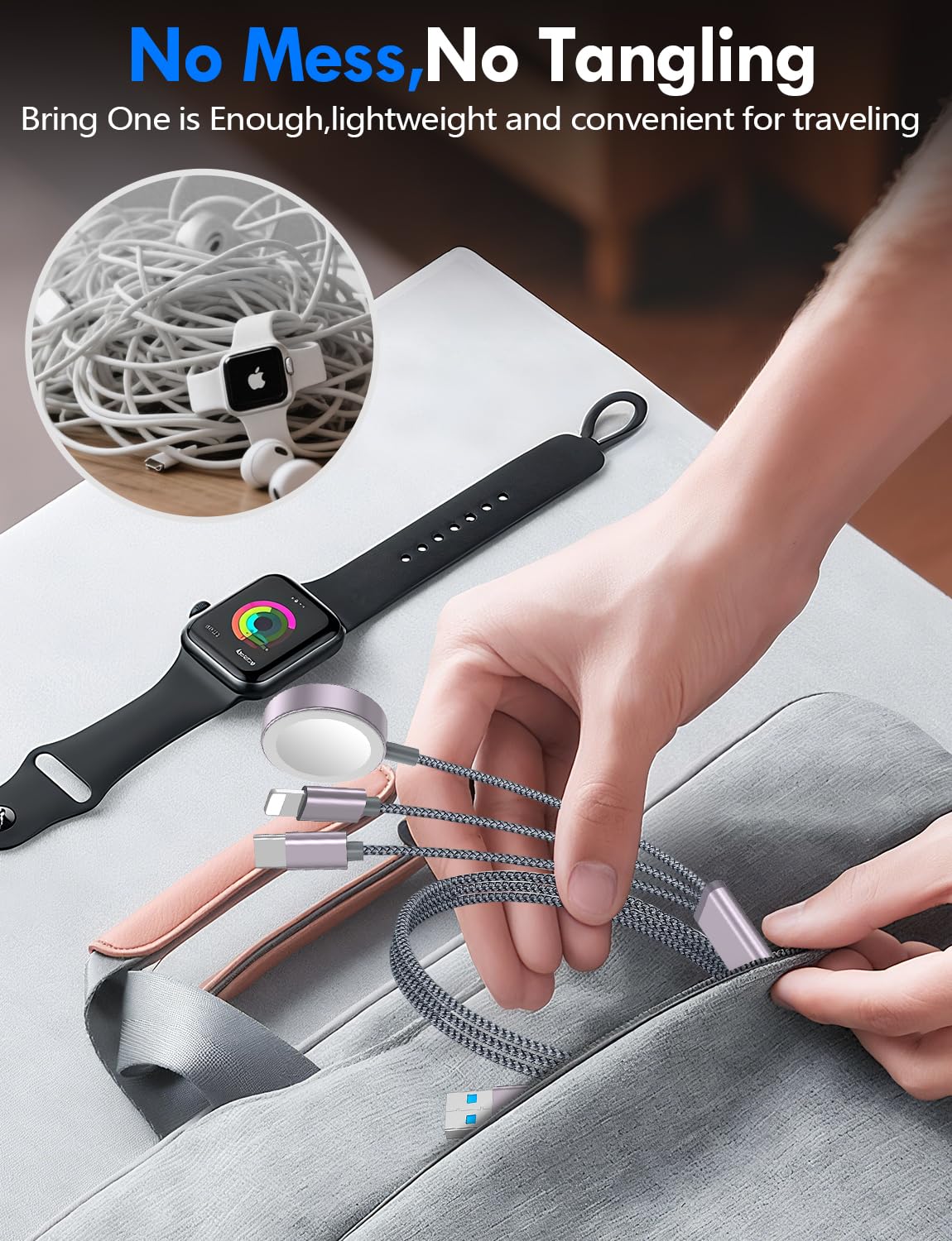 • 【Portable Travel Camping Essentials&Car accessories】This 1.25M/4ft 3 in 2 charging cable is convenient to carry around with lightweight and portable design.It fits seamlessly into travel vocation essentials like bags and suitcases so it is a perfect choice when going on holiday,business trip,travel,office,dorm life,apartment living, college campuses,and hiking adventures. Ideal for charging in car,Charge iPhone, iWatch, and USB A to C cable-compatible devices simultaneously—no adapters needed.