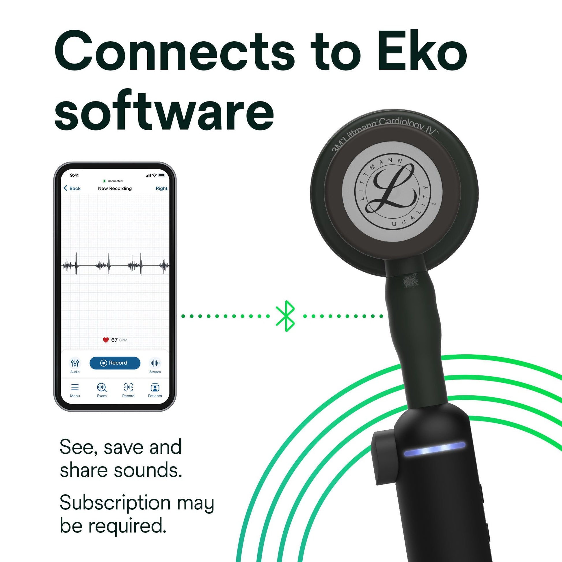 • The 3M Littmann CORE Stethoscope connects with Eko software on a smart device to visualize, record and share data. (Smart device not included. Some features require a subscription)