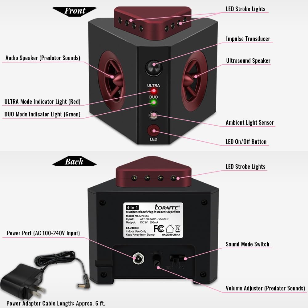 • Effective Combination of Sounds and LED Strobe Lights: Loraffe 4 in 1 multifunctional rodent repellent emits a powerful mix of ultrasonic frequencies, impulse waves, and predator sounds, combined with LED strobe lights, to create an unpleasant environment that effectively deters rodents.