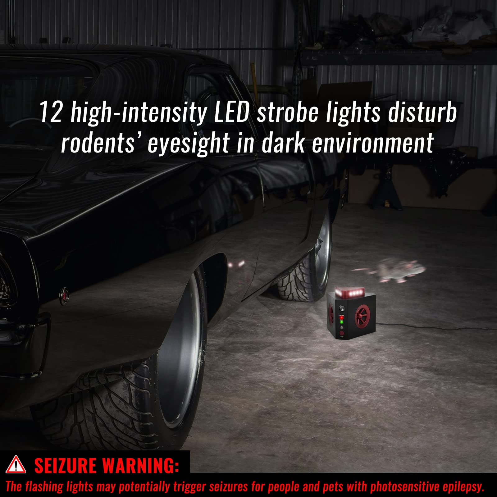 • 12 High-Intensity LED Strobe Lights with Dusk-to-Dawn Sensor: Equipped with 12 LED strobe lights, arranged in 3 groups on a triangular plate, this electronic rodent repellent target rodents' vision from all directions, using a dusk-to-dawn sensor to maximize the effect in dark environments, making it an ideal deterrent for mice, rats, and other pests.