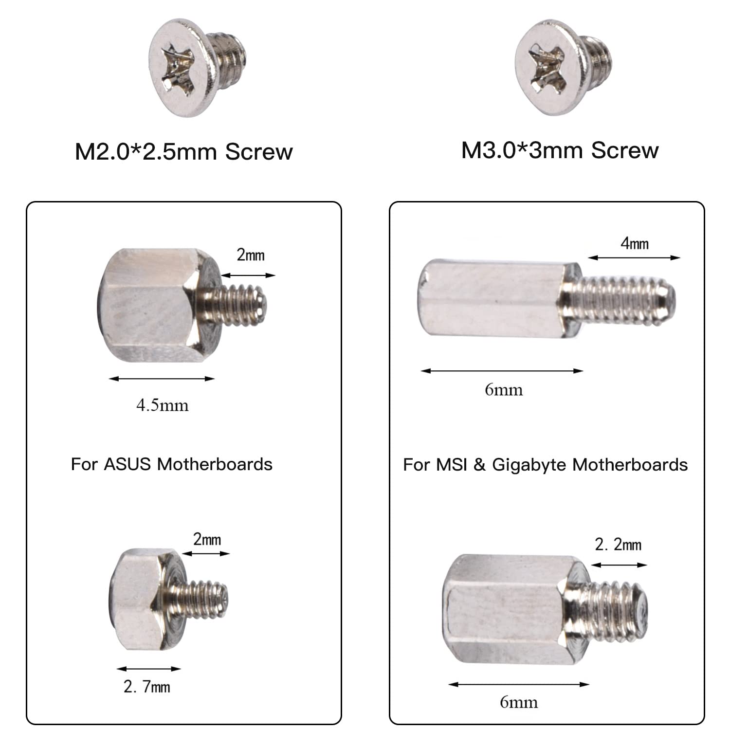 • Total 16 different m.2 screws & m2 m3 m2.5 ssd mounting computer screws kit with 500 pcs, offering a 99% fit in all types of ASUS Gigabyte MSI motherboard. M.2 standoff and screw for M.2 slot on ASUS Gigabyte & MSI motherboards.