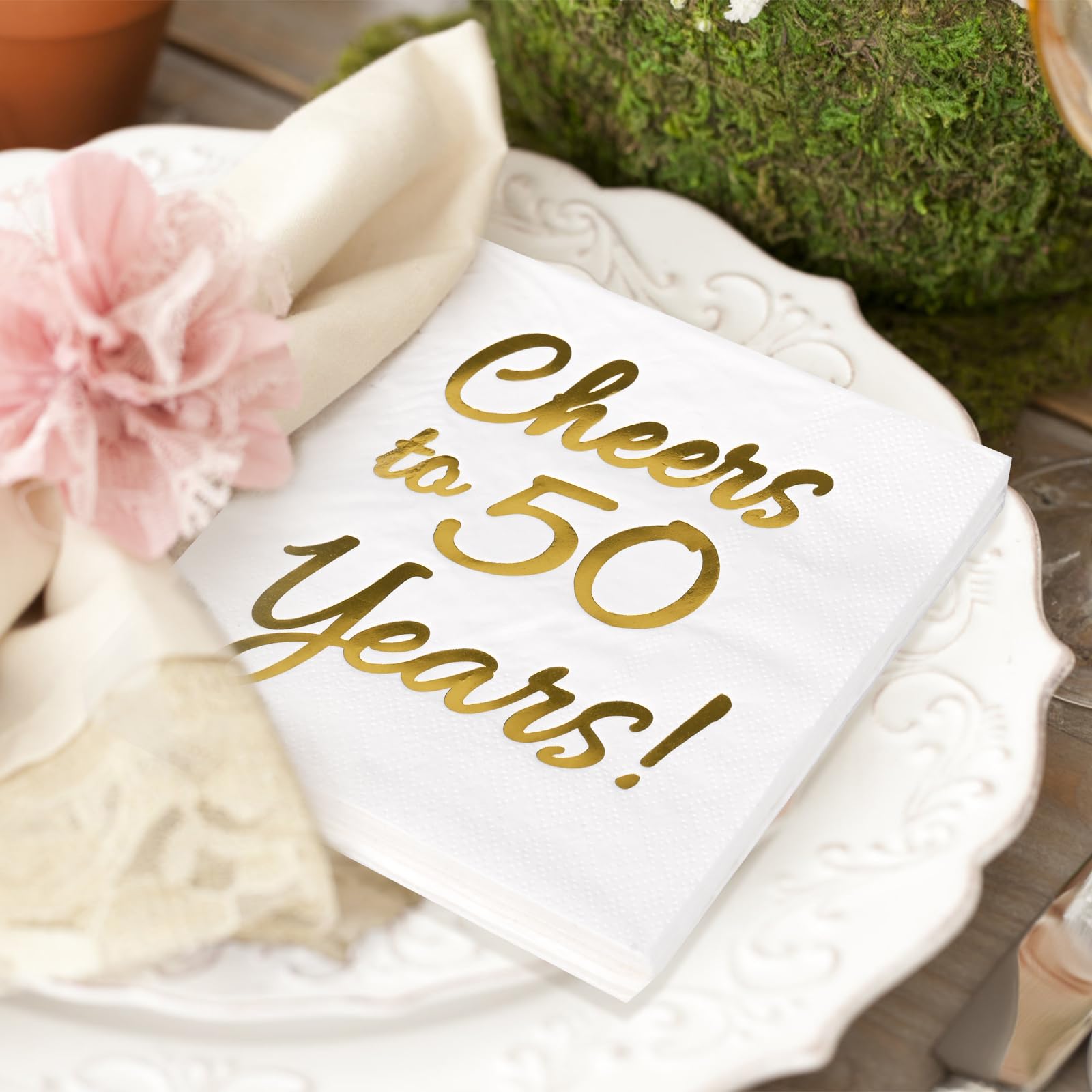 • Party Essentials: 50 pack white paper napkins printed in classic 'Cheers to 50 years' gold foil text. 50th birthday decorations for women or men.Measuring 5x5 inches.