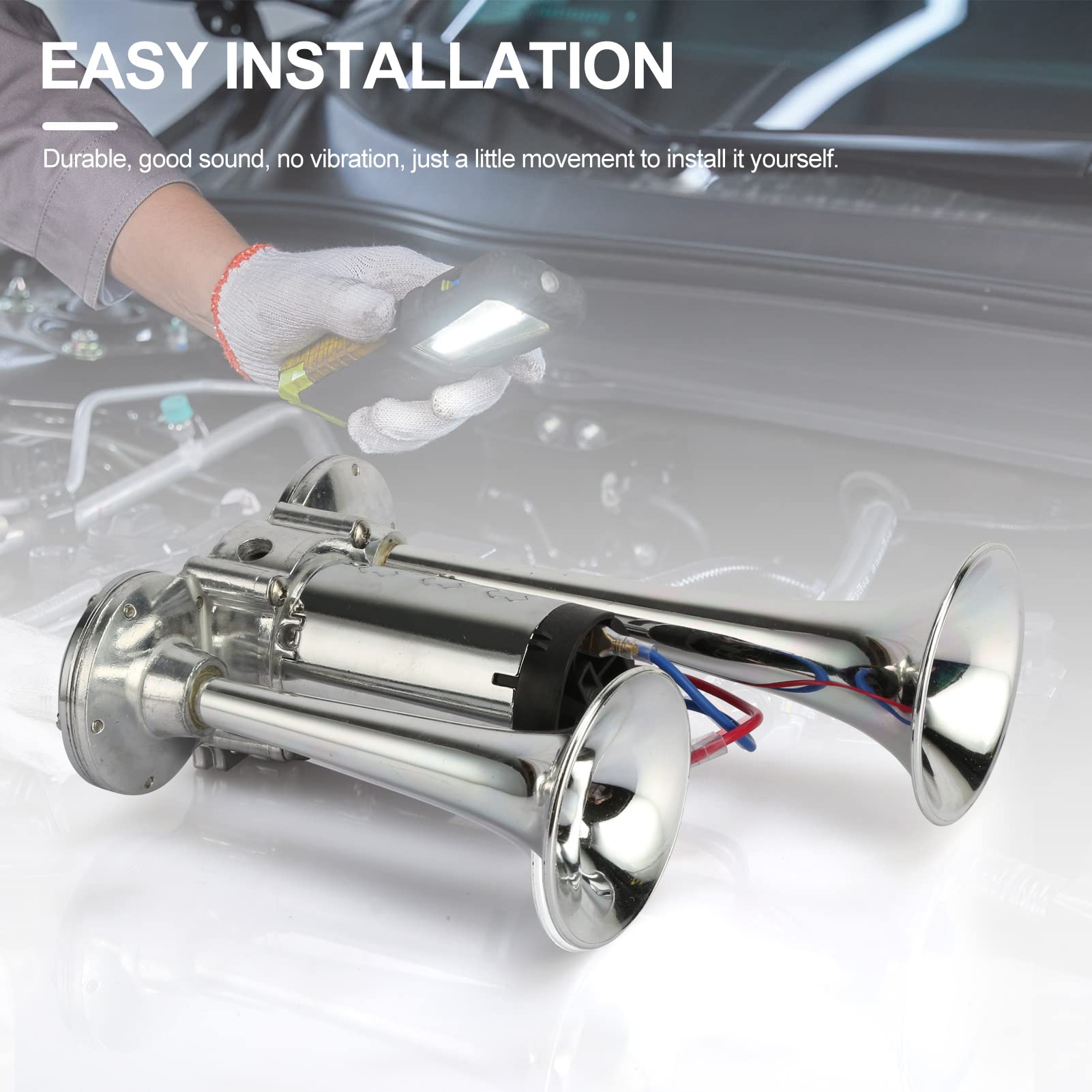 • [Easy to Install]: Our train horn kit is very easy to install. You just need to connect the horn wire on the car and the two wires from the air horn, and it will work normally Positive to positive, negative to negative(The installation instructions for the product are attached to our products, and you can install them by checking the instructions).
