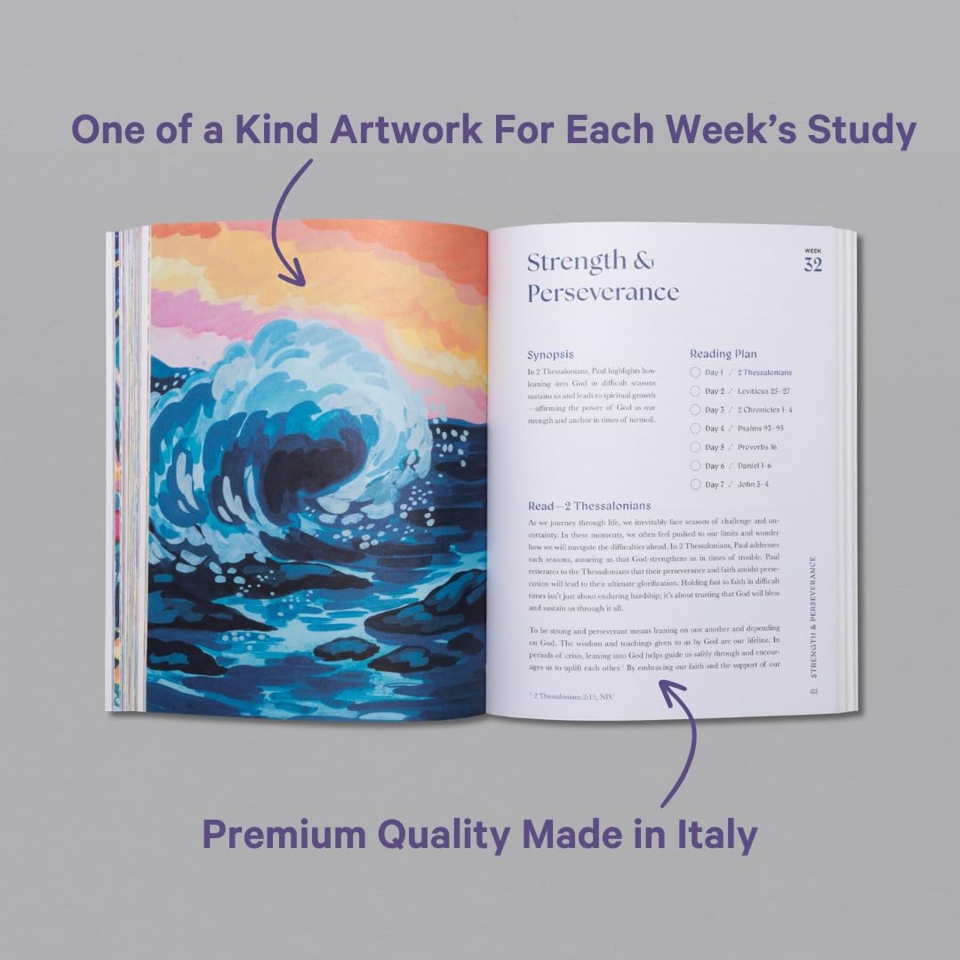 Study the Entire Bible in One Year: With suggested readings for each day of the week, and thoughtful prompts to invite deeper reflection, this book invites us to explore the story of scripture with fresh eyes and focused intention. Explore topics such as: The Relationship Between God and Humanity The Beauty of Serving Others Living Out Our Faith The Work of the Cross The Joy of Worship Courage in the Face of Opposition And 46 additional chapters