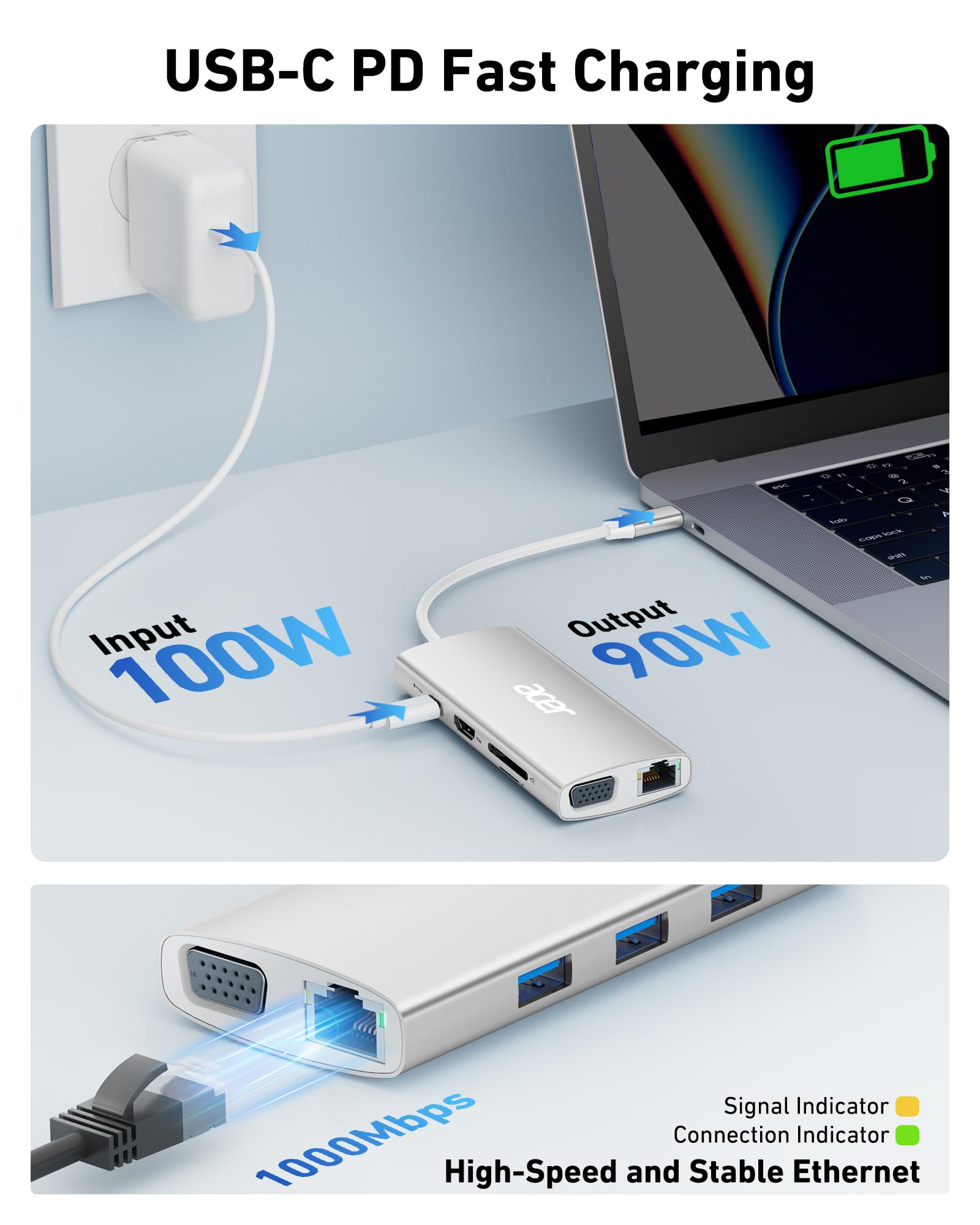 Acer USB C Hub with 4k@30Hz HDMI, 9-in-1 USB C to Ethernet Adapter, 5Gbps USB-A 3.1 Docking Station, PD 100W Charging, SD Card Reader, USB to VGA Splitter for MacBook, Acer, Laptops, Surface (Silver)