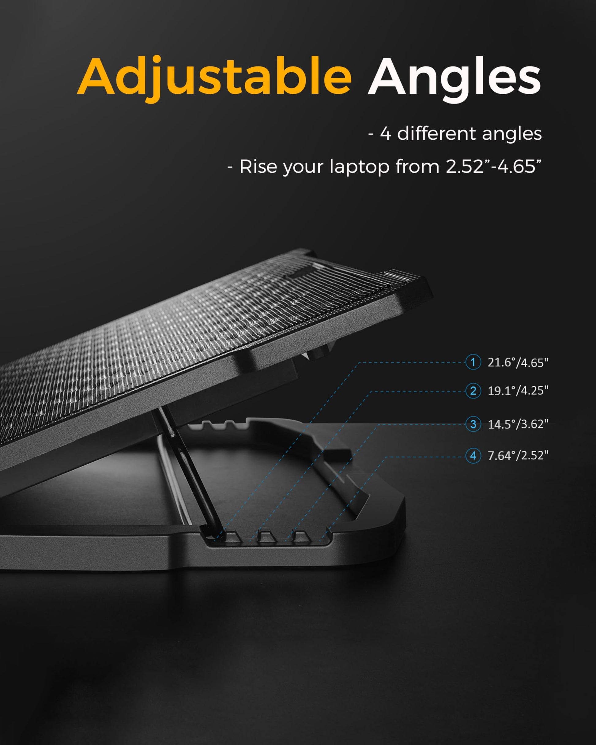 • The computer cooling base can help to raise height from 2.4' - 4.8', and the angles is available to be adjusted from 7.5 - 21.5 degrees. Help to relieve neck pain caused by prolonged pc use and incorrect posture.