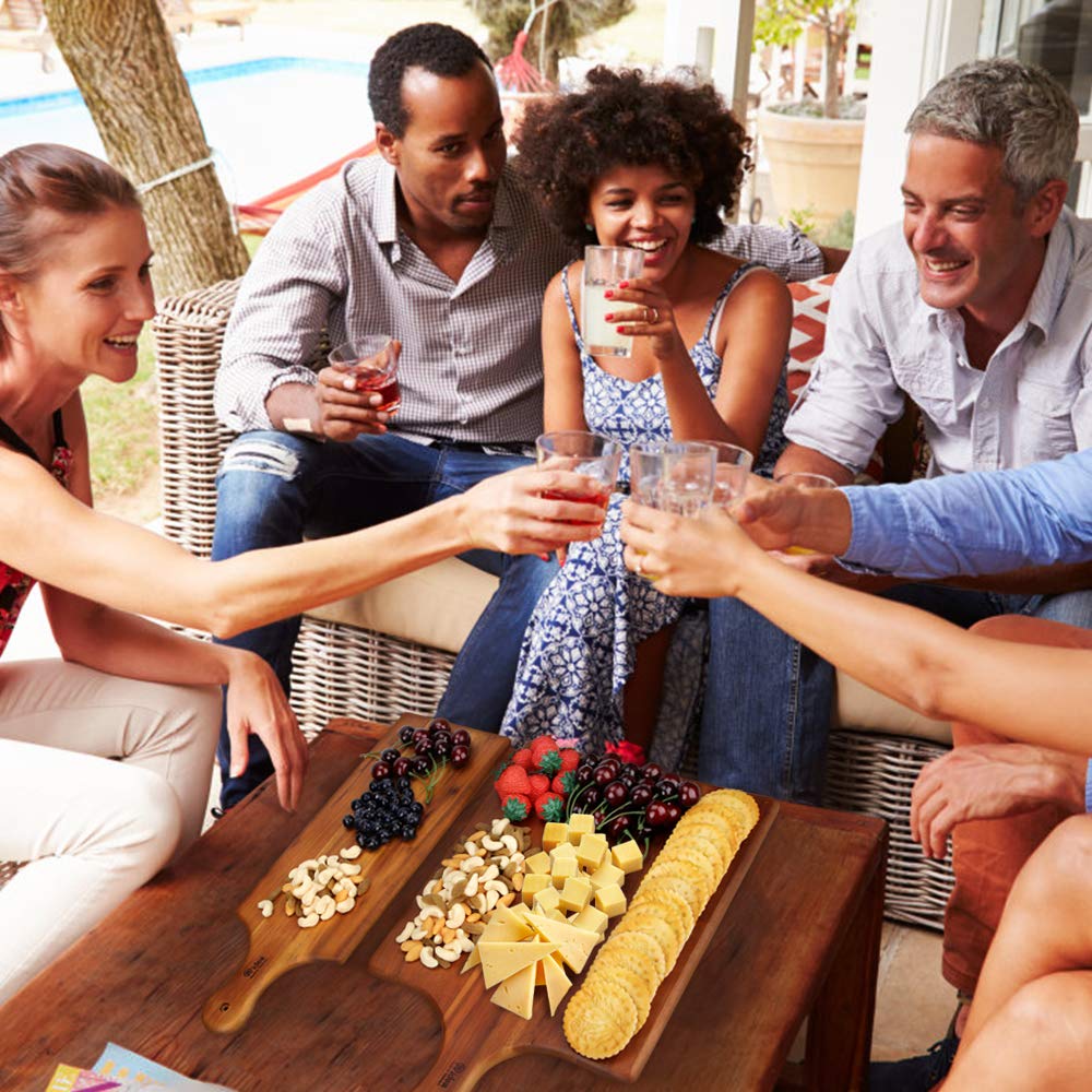 • Suitable Size: Acacia wood cutting board cheese board serving tray; measures 17 inches long with handle, 6 inches wide, 0.5 inches thick; ideal for serving bread, cheese, sandwiches, and party snacks at the table