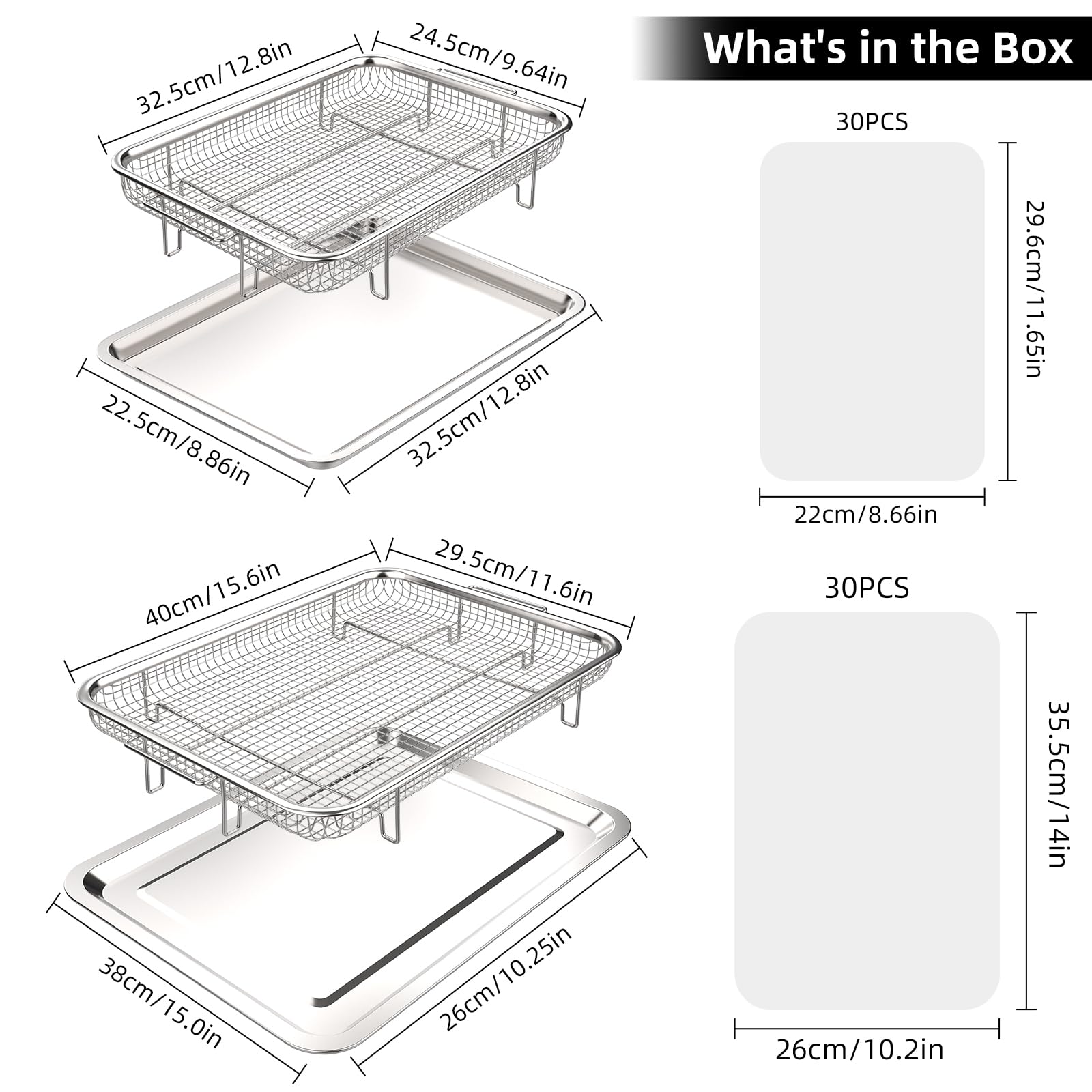 • 【Great Value with Pack of 6】Package includes 2-pieces Large Air Fryer Basket and Tray Set sized at 15.6×11.6 inches, 2-pieces Medium Set sized at 12.8×9.6 inches, and 2 packs of pacherment papers(30 count/ size), ideal for most regular oven with air fry option or wall oven. Can work perfectly together and superbly apart.