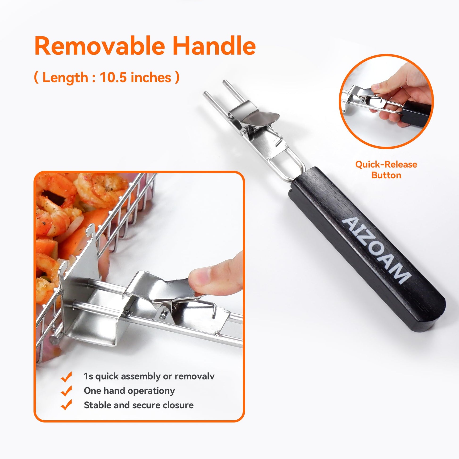 • ๐‘๐ž๐ฆ๐จ๐ฏ๐š๐›๐ฅ๐ž ๐€๐ง๐ญ๐ข-๐’๐ฅ๐ข๐ฉ ๐‡๐š๐ง๐๐ฅ๐ž: The AIZOAM grill basket features a detachable heat-resistant handle, easy to access the grilling basket. When grilling at high temperatures, remove the handle and place the basket on the grill to protect you from the heat of the grill. The handle can be removed and placed inside the fish grill basket, which can then be stored in the storage bag for easy storage and transportation. Perfect for family barbecues or gourmet outdoor gatherings.